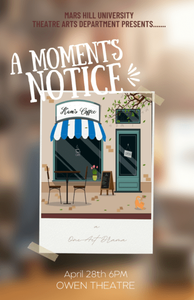 The Mars Hill University Theatre Arts Department is proud to present “A Moment’s Notice”, a one-act drama written by a student for their senior project and directed by Theatre Arts Department Chair Sue Fair. The performance will take place on April 28th at 6PM in the Owen Theatre on the university’s campus.