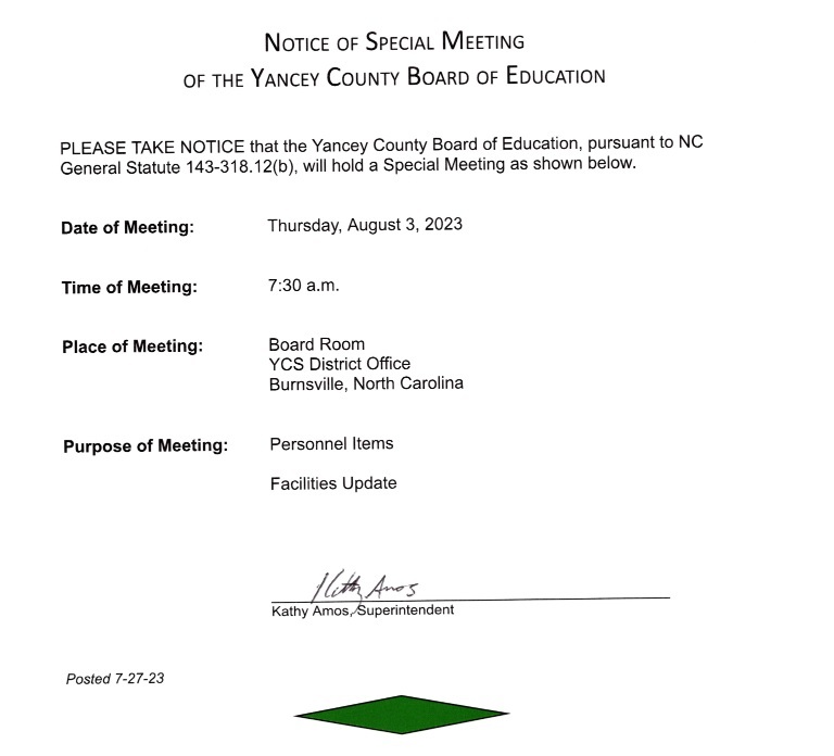 Yancey Board of Ed Special Meeting 8/3–Revised