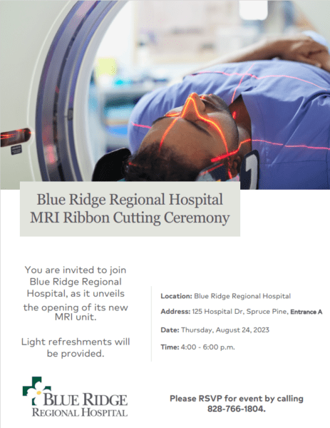 Blue Ridge Regional Hospital is excited to announce the opening of their new MRI. It has the latest capabilities, an extra-wide bore to accommodate large persons and minimize claustrophobia, as well as state-of-the art headsets with music selection and noise control. The Ribbon Cutting Ceremony is scheduled for August 24th at 4pm in the hospital lobby. To RSVP, please call 828-766-1804.