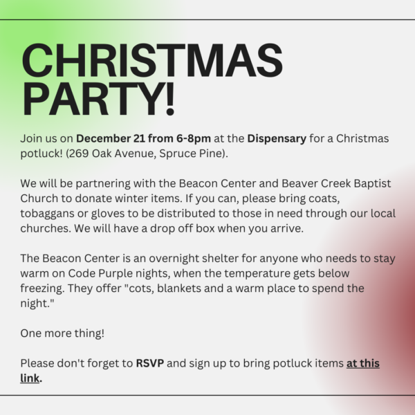 The Mitchell County Democratic Party will host its Christmas potluck party at The Dispensary (269 Oak Avenue) in Spruce Pine. The evening will consist of great food, good music, and warm fellowship. The MCDP will be partnering with the Beacon Center to donate winter items. Please bring coats, tobaggans, or gloves to be distributed to those in need through our local churches. We will have a drop off box when you arrive. The Beacon Center is an overnight shelter for anyone who needs to stay warm on Code Purple nights, when the temperature gets below freezing. They offer “cots, blankets and a warm place to spend the night.” Please don’t forget to RSVP by December 14, 2023 and sign up to bring potluck items at: https://docs.google.com/forms/