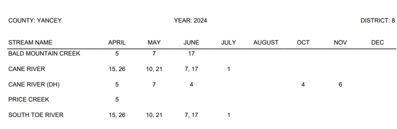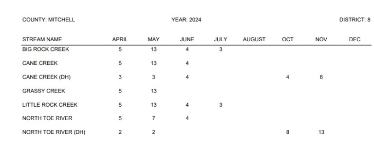 The Wildlife Commission has posted the full Hatchery Supported Trout Waters stocking schedule on its website (Mitchell & Yancey below) to give trout anglers opportunities to plan fishing trips in advance. The schedule is searchable by county and month and provides information on what days each water is being stocked.