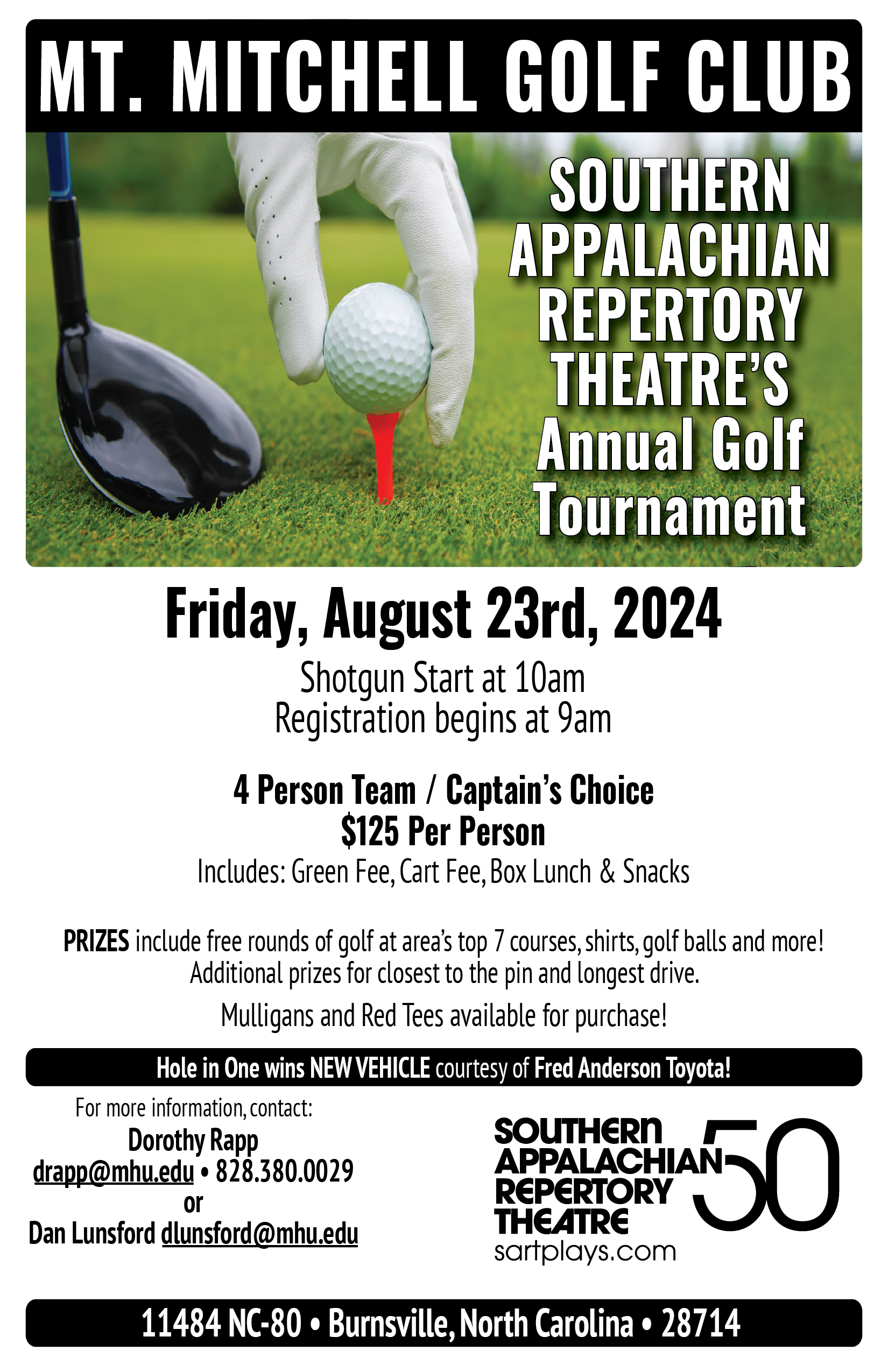 Ending its landmark 50th season, Southern Appalachian Repertory Theatre is excited to host local golfers for the 4th annual SART Golf Tournament at Mount Mitchell Golf Club in Burnsville, North Carolina. SART has drawn acclaim for each of its eight productions this season, and the tournament aims to raise funds for productions during the next season at SART. In the past, the tournament has served as a vital event for the theatre, drawing both community attention and resources to the non-profit during the start of the theatre’s offseason. Taking place Friday, August 23rd, theatre staff hope that the annual event may expose new audiences to SART. The tournament will begin with a shotgun start at 10am, and a new vehicle from Fred Anderson Toyota of Asheville will be given for a hole-in-one. In addition, a variety of prizes, such as free rounds of golf and gift certificates, will also be given to winners. Registration for teams is still open. For more information, please visit sartplays.com/golf. ### Southern Appalachian Repertory Theatre (SART) is a professional theatre company in residence at the historic Owen Theatre in Mars Hill, North Carolina. Founded in 1975 by director and theatre educator Jim Thomas, SART has produced scores of original works, plays, and musicals over the years portraying the rich culture and heritage of Southern Appalachia.