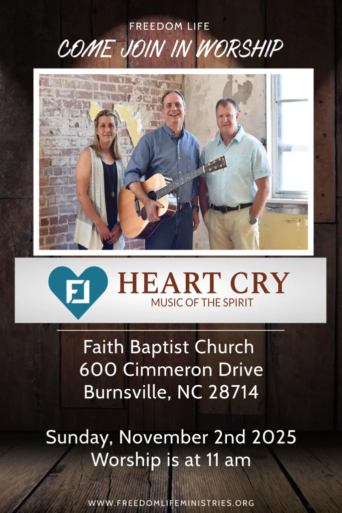 Heart Cry is a singing group that is a part of Freedom Life Ministries. Come join us in worship this Sunday at Faith Baptist Church. The address is 600 Cimmeron Drive Burnsville, NC 28714 Worship is at 11 am.