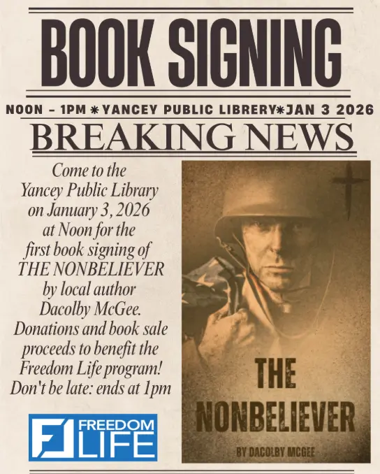15 year old Dacolby McGee from Mountain Heritage High School will be having his first book signing on the 3rd of January 2026 for his Book THE NONBELIEVER. Dacolby is a Local author. He is partnering up with the Freedom Life Center and all proceeds will go to the Program. The book signing will be held in the Meeting room of the Yancey Public Library starting at noon and will end at one pm. You can get his book on Amazon for $15. Come out and support this young author and donate to a good cause.