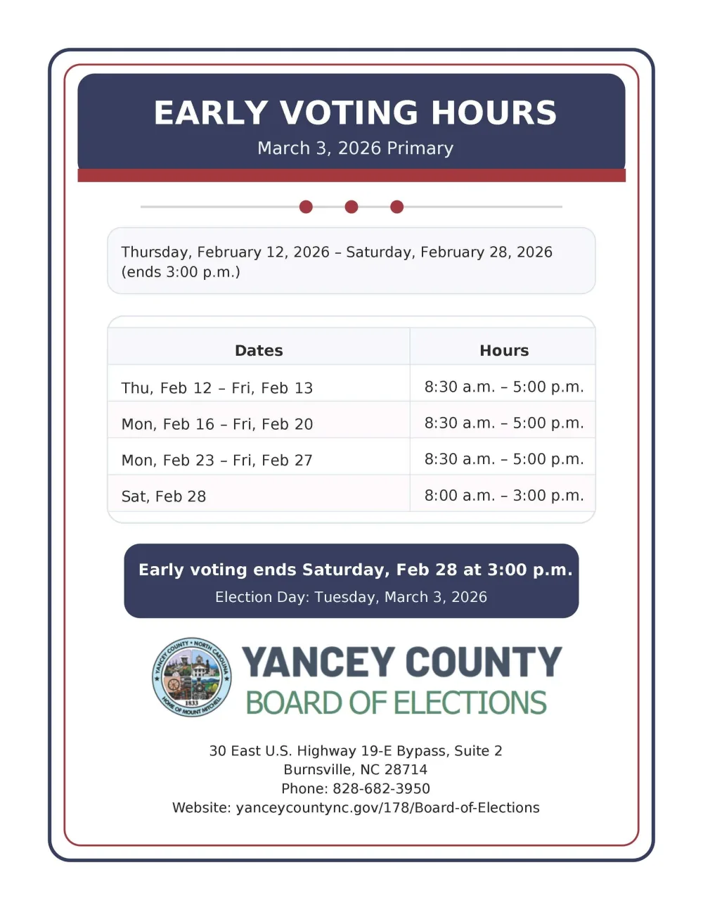 Questions? Call the Yancey County Board of Elections Office at (828) 682-3950 or send an email to boe@yanceycountync.gov.