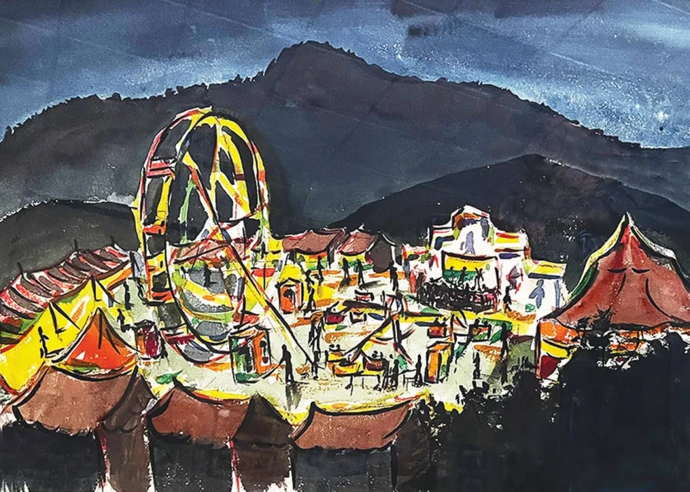 “Circus Comes to Burnsville” by Charles Lewis Woods, watercolor on paper, Burnsville Painting classes mid-1950s.