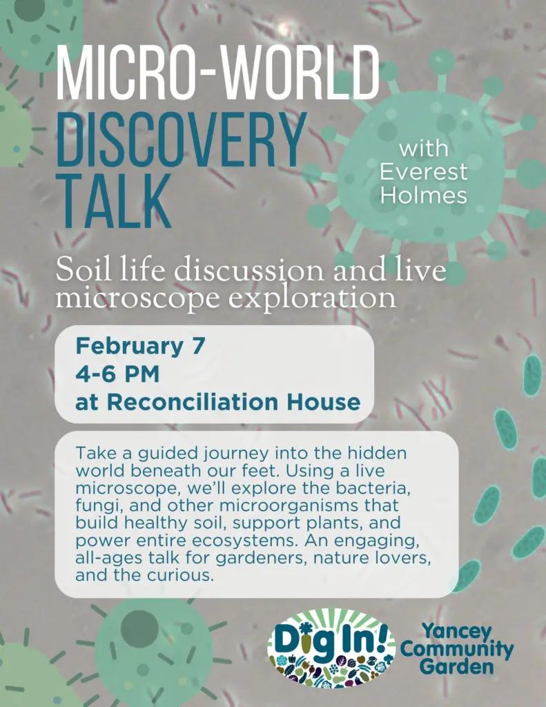 Join Dig In! Community Garden for an immersive Micro-World Discovery Talk at the Reconciliation House on February 7 from 4–6 PM, where we’ll zoom into the hidden universe that makes healthy soil and healthy ecosystems possible.