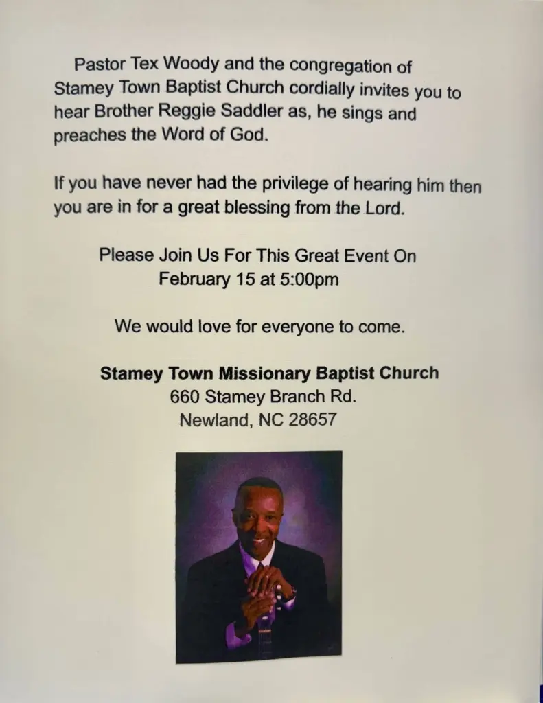 Reggie Sadler To Sing & Preach at Stameytown Baptist