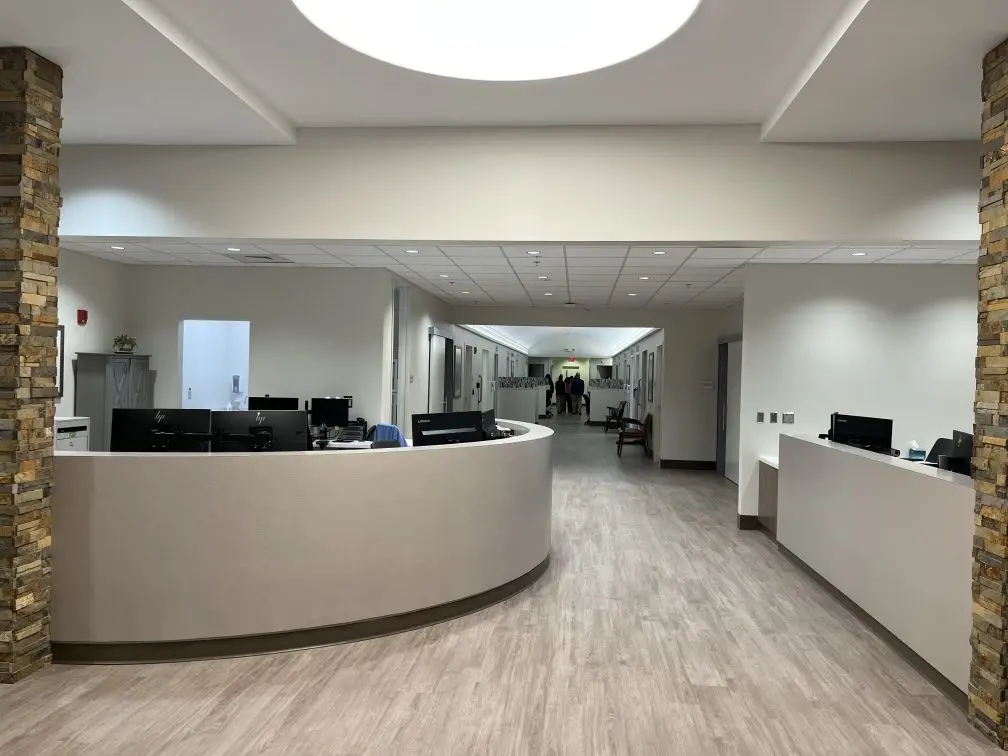 The renovation expanded the infusion suite from 12 to 16 infusion chairs and added six new clinical spaces, including five exam rooms and one additional treatment room. Infusion areas were redesigned to offer more privacy and comfort, with larger spaces that allow patients to have a support person with them during treatment, dedicated seating for companions, and room to store personal belongings. A separate check-in desk for infusion patients was also added to improve efficiency and reduce wait times.