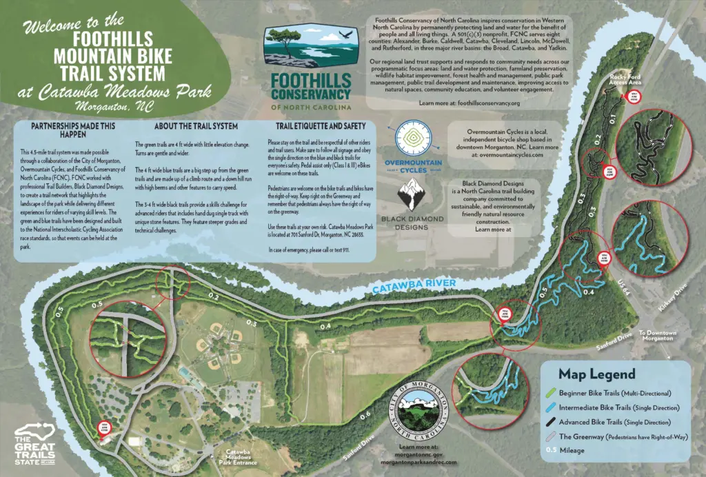 Foothills Conservancy of North Carolina (FCNC), in collaboration with Morganton Parks and Recreation, Overmountain Cycles, Black Diamond Trail Designs, and the North Carolina Interscholastic Cycling League (NCICL), will host a ribbon cutting ceremony for the new Foothills Mountain Bike Trail System at Catawba Meadows Park on Monday, May 5 at 10:00 a.m. at 220 Catawba Meadows Drive, Morganton.
